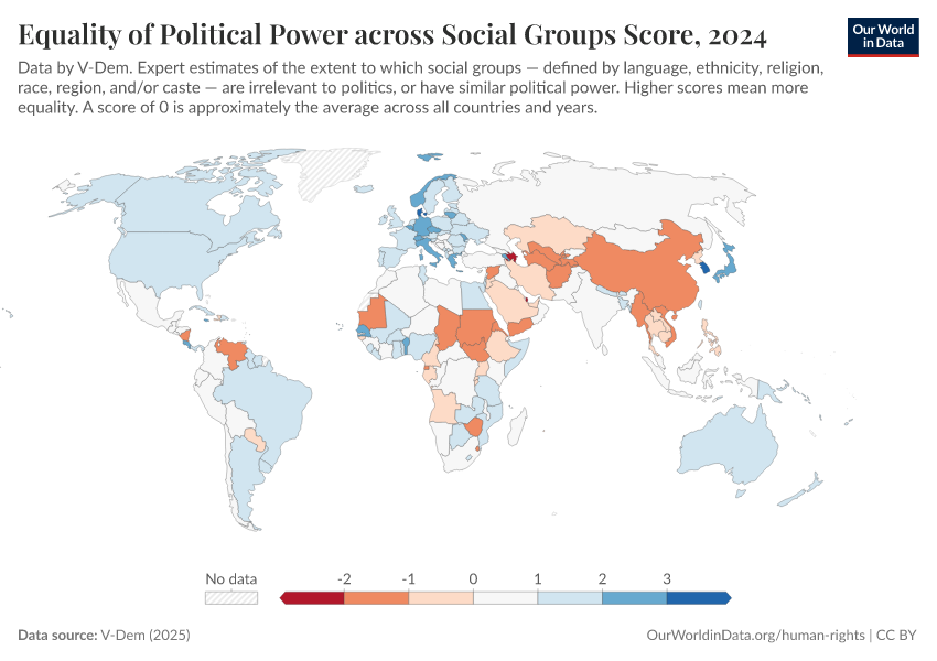 “Data Page: Equality of political power across social groups”, part of the following publication: Bastian Herre, Lucas Rodés-Guirao, and Esteban Ortiz-Ospina (2013) - “Democracy”. Data adapted from V-Dem. Retrieved from https://data-faostat-update-datasets.owid.pages.dev:8789/20260204-170225/grapher/equality-of-political-power-across-social-groups-score.html [online resource] (archived on February 4, 2026).How to cite this data