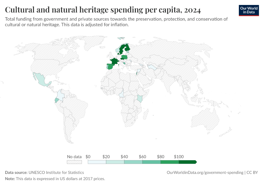 “Data Page: Cultural and natural heritage spending per capita”. Our World in Data (2026). Data adapted from UNESCO Institute for Statistics. Retrieved from https://data-faostat-update-datasets.owid.pages.dev:8789/20251120-211749/grapher/expenditure-on-cultural-and-natural-heritage-per-capita.html [online resource] (archived on November 20, 2025).How to cite this data