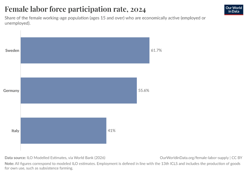 ILO Modelled Estimates, via World Bank (2026) – processed by Our World in Data. “Female labor force participation rate – ILO” [dataset]. ILO Modelled Estimates, via World Bank, “World Development Indicators 125” [original data]. Retrieved March 3, 2026 from https://data-faostat-update-datasets.owid.pages.dev:8789/20260301-083443/grapher/female-labor-force-participation-rates.html (archived on March 1, 2026).