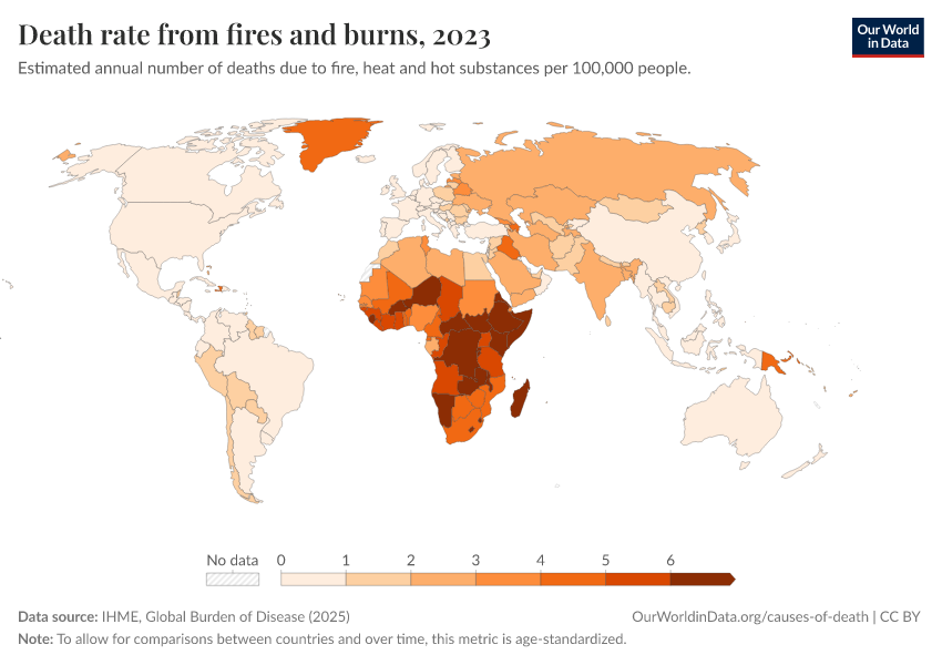 IHME, Global Burden of Disease (2025) – with major processing by Our World in Data. “Death rate from fires and burns” [dataset]. IHME, Global Burden of Disease, “Global Burden of Disease - Deaths” [original data]. Retrieved March 3, 2026 from https://data-faostat-update-datasets.owid.pages.dev:8789/20260211-173942/grapher/fire-death-rates.html (archived on February 11, 2026).