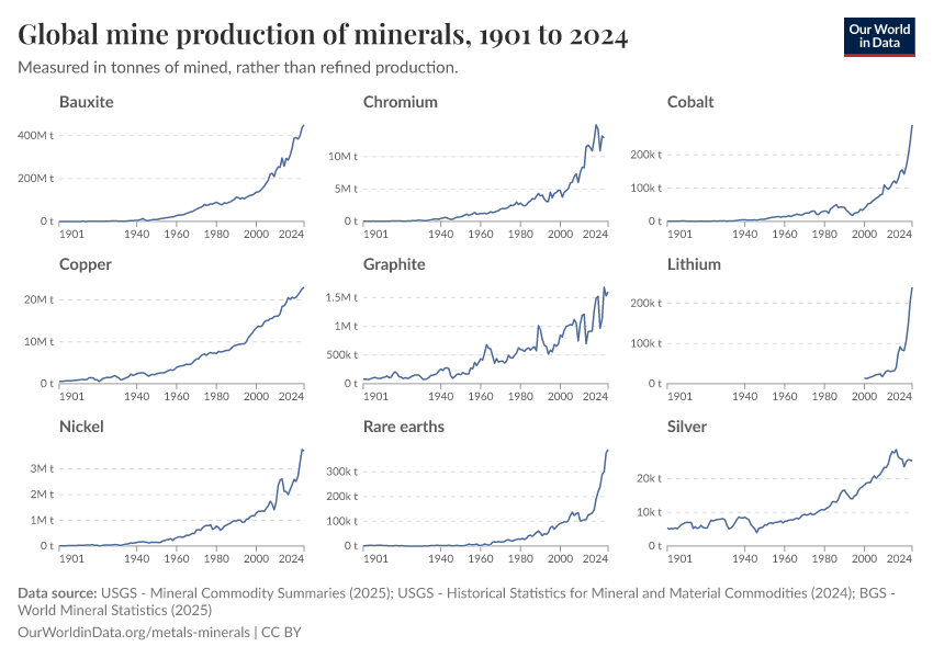 “Data Page: Global mine production of minerals”. Our World in Data (2026). Data adapted from United States Geological Survey, British Geological Survey. Retrieved from https://data-faostat-update-datasets.owid.pages.dev:8789/20260116-170644/grapher/global-mine-production-minerals.html [online resource] (archived on January 16, 2026).How to cite this data