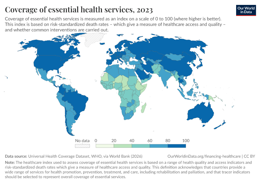“Data Page: Coverage of essential health services”. Our World in Data (2026). Data adapted from Universal Health Coverage Dataset, WHO, via World Bank. Retrieved from https://data-faostat-update-datasets.owid.pages.dev:8789/20260301-083443/grapher/healthcare-access-quality-un.html [online resource] (archived on March 1, 2026).How to cite this data