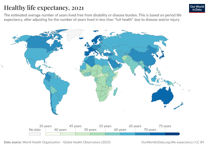 “Data Page: Healthy life expectancy”. Our World in Data (2026). Data adapted from World Health Organization. Retrieved from https://data-faostat-update-datasets.owid.pages.dev:8789/20260119-070102/grapher/healthy-life-expectancy-at-birth.html [online resource] (archived on January 19, 2026).How to cite this data