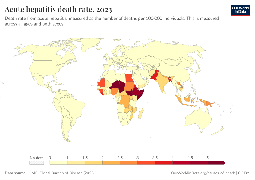 “Data Page: Acute hepatitis death rate”, part of the following publication: Esteban Ortiz-Ospina and Max Roser (2016) - “Global Health”. Data adapted from IHME, Global Burden of Disease. Retrieved from https://data-faostat-update-datasets.owid.pages.dev:8789/20260211-174736/grapher/hepatitis-death-rate.html [online resource] (archived on February 11, 2026).How to cite this data