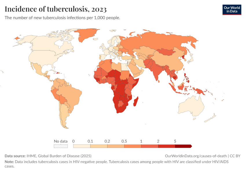 IHME, Global Burden of Disease (2025) – with major processing by Our World in Data. “Incidence of tuberculosis” [dataset]. IHME, Global Burden of Disease, “Global Burden of Disease - Prevalence and Incidence” [original data]. Retrieved March 3, 2026 from https://data-faostat-update-datasets.owid.pages.dev:8789/20260212-172859/grapher/incidence-of-tuberculosis.html (archived on February 12, 2026).