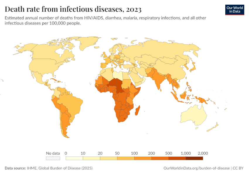 IHME, Global Burden of Disease (2025) – with major processing by Our World in Data. “Death rate from infectious diseases” [dataset]. IHME, Global Burden of Disease, “Global Burden of Disease - Deaths” [original data]. Retrieved March 3, 2026 from https://data-faostat-update-datasets.owid.pages.dev:8789/20260211-174736/grapher/infectious-disease-death-rates-gbd.html (archived on February 11, 2026).