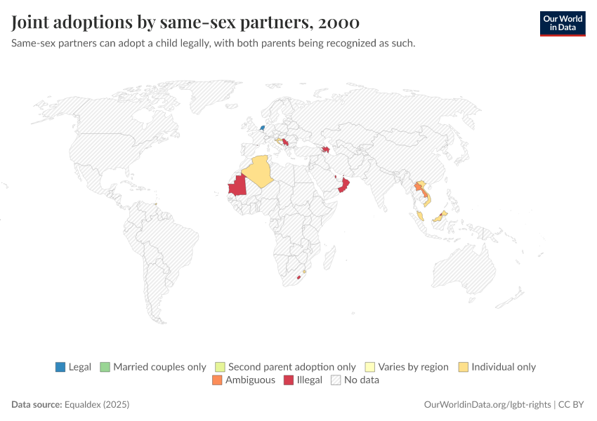 Equaldex (2025) – with major processing by Our World in Data. “Joint adoptions by same-sex partners” [dataset]. Equaldex, “Equaldex” [original data]. Retrieved March 3, 2026 from https://data-faostat-update-datasets.owid.pages.dev:8789/20250909-093708/grapher/joint-adoptions-same-sex-partners-equaldex.html (archived on September 9, 2025).