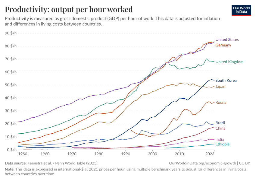Feenstra et al. - Penn World Table (2025) – with major processing by Our World in Data. “Productivity: output per hour worked – Penn World Table – In constant international-$” [dataset]. Feenstra et al., “Penn World Table 11.0” [original data]. Retrieved March 3, 2026 from https://data-faostat-update-datasets.owid.pages.dev:8789/20251013-111729/grapher/labor-productivity-per-hour-pennworldtable.html (archived on October 13, 2025).