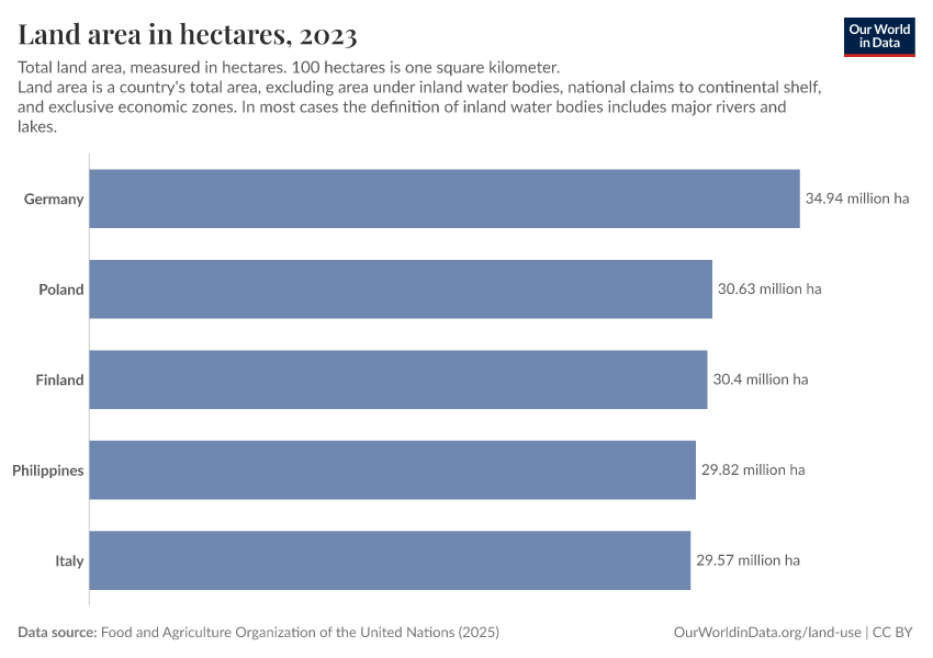 “Data Page: Land area in hectares”, part of the following publication: Hannah Ritchie, Pablo Rosado, and Max Roser (2023) - “Agricultural Production”. Data adapted from Food and Agriculture Organization of the United Nations. Retrieved from https://data-faostat-update-datasets.owid.pages.dev:8789/20260226-122020/grapher/land-area-hectares.html [online resource] (archived on February 26, 2026).