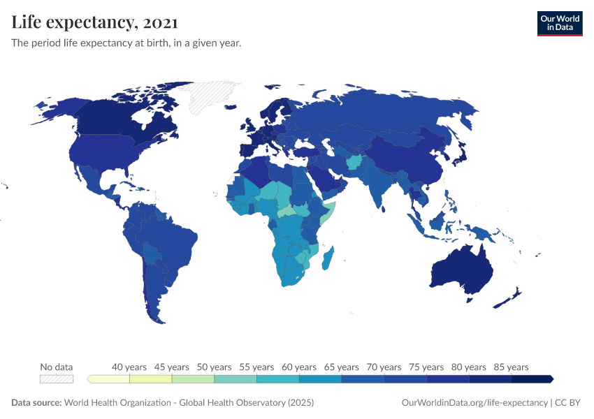 “Data Page: Life expectancy”. Our World in Data (2026). Data adapted from World Health Organization. Retrieved from https://data-faostat-update-datasets.owid.pages.dev:8789/20260119-070102/grapher/life-expectancy-at-birth-who-gho.html [online resource] (archived on January 19, 2026).How to cite this data