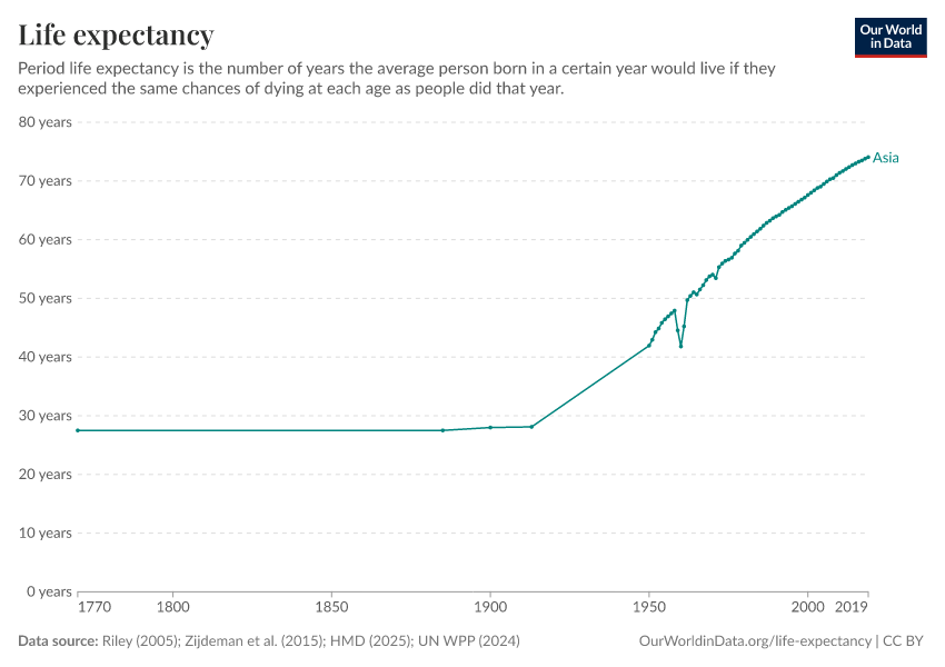 • This chart shows long-run estimates of life expectancy compiled by our team from several data sources. Before 1950, for country-level data, we rely on the Human Mortality Database (2025) combined with Zijdeman (2015). For regional data, we use Riley (2005). From 1950 onward, we use the United Nations World Population Prospects (2024).
