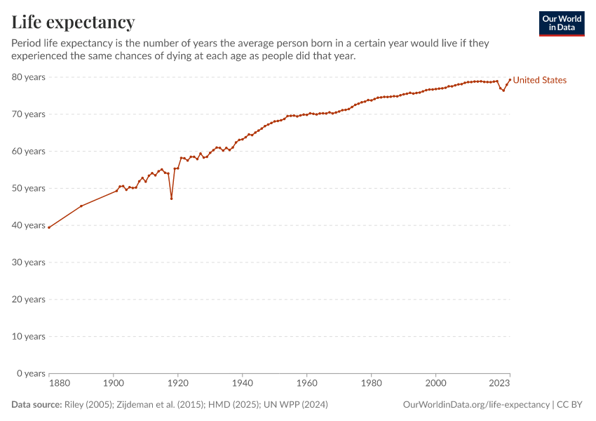 This chart combines data from several sources. For country-level data before 1950, we use the Human Mortality Database (2025) data and Zijdeman et al. (2015). For country-years where these sources overlap, we use the Human Mortality Database.