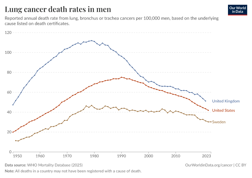 “Data Page: Lung cancer death rates in men”, part of the following publication: Saloni Dattani, Fiona Spooner, Hannah Ritchie, and Max Roser (2023) - “Causes of Death”. Data adapted from WHO Mortality Database. Retrieved from https://data-faostat-update-datasets.owid.pages.dev:8789/20250909-093708/grapher/lung-cancer-death-rates-males.html [online resource] (archived on September 9, 2025).How to cite this data