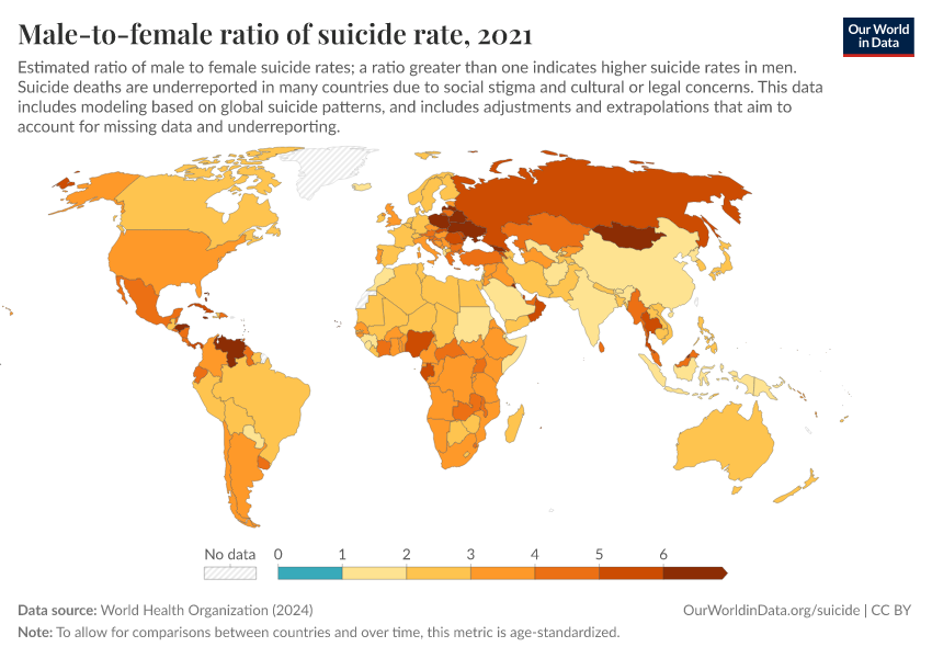 World Health Organization (2024) – with major processing by Our World in Data. “Male-to-female ratio of suicide rate” [dataset]. World Health Organization, “Global Health Estimates” [original data]. Retrieved March 3, 2026 from https://data-faostat-update-datasets.owid.pages.dev:8789/20250909-093708/grapher/male-female-ratio-suicides-rates.html (archived on September 9, 2025).