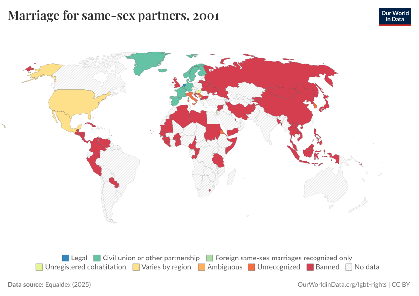 “Data Page: Marriage for same-sex partners”, part of the following publication: Bastian Herre and Pablo Arriagada (2023) - “LGBT+ Rights”. Data adapted from Equaldex. Retrieved from https://data-faostat-update-datasets.owid.pages.dev:8789/20250909-093708/grapher/marriage-same-sex-partners-equaldex.html [online resource] (archived on September 9, 2025).