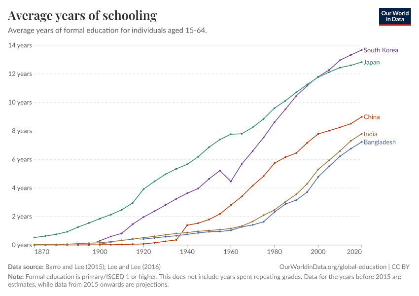 Barro and Lee (2015); Lee and Lee (2016) – with major processing by Our World in Data. “Average years of schooling” [dataset]. Barro and Lee, “Projections of Educational Attainment”; Lee and Lee, “Human Capital in the Long Run” [original data]. Retrieved March 3, 2026 from https://data-faostat-update-datasets.owid.pages.dev:8789/20260119-070102/grapher/mean-years-of-schooling-long-run.html (archived on January 19, 2026).
