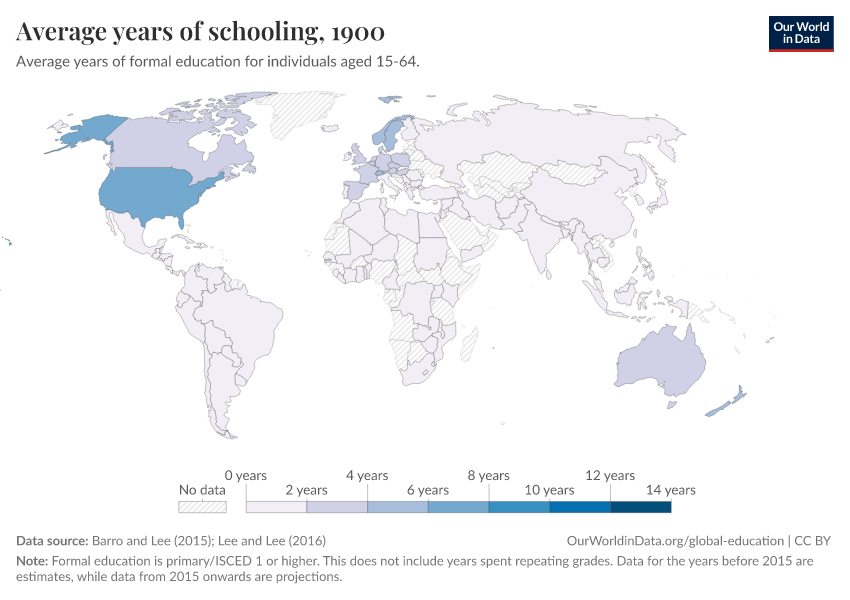 “Data Page: Average years of schooling”, part of the following publication: Hannah Ritchie, Veronika Samborska, Esteban Ortiz-Ospina, and Max Roser (2023) - “Global Education”. Data adapted from Barro and Lee, Lee and Lee. Retrieved from https://data-faostat-update-datasets.owid.pages.dev:8789/20260119-070102/grapher/mean-years-of-schooling-long-run.html [online resource] (archived on January 19, 2026).How to cite this data
