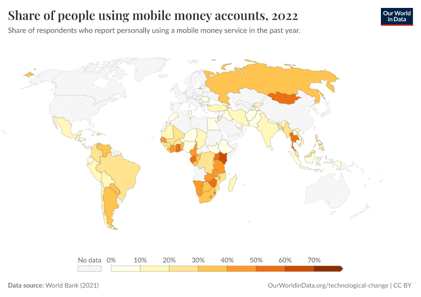“Data Page: Share of people using mobile money accounts”, part of the following publication: Max Roser, Bertha Rohenkohl, Pablo Arriagada, Joe Hasell, Hannah Ritchie, and Esteban Ortiz-Ospina (2023) - “Economic Growth”. Data adapted from World Bank. Retrieved from https://data-faostat-update-datasets.owid.pages.dev:8789/20250909-093708/grapher/mobile-money-account-usage.html [online resource] (archived on September 9, 2025).How to cite this data