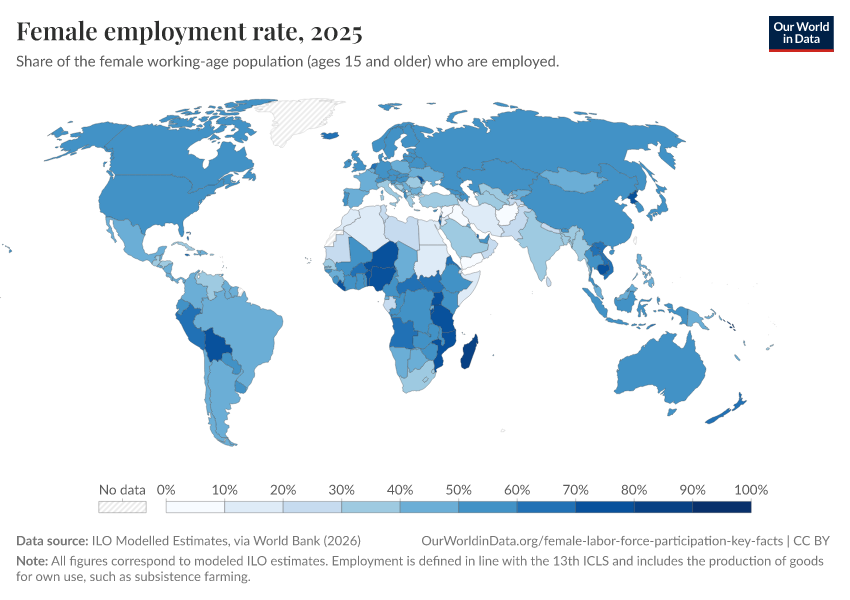 ILO Modelled Estimates, via World Bank (2026) – processed by Our World in Data. “Female employment rate – ILO” [dataset]. ILO Modelled Estimates, via World Bank, “World Development Indicators 125” [original data]. Retrieved March 3, 2026 from https://data-faostat-update-datasets.owid.pages.dev:8789/20260301-083443/grapher/modeled-female-employment-to-population-ratio.html (archived on March 1, 2026).