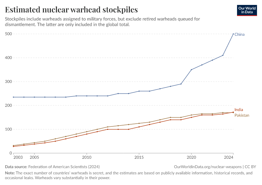 “Data Page: Estimated nuclear warhead stockpiles”, part of the following publication: Bastian Herre, Pablo Rosado, and Max Roser (2024) - “Nuclear Weapons”. Data adapted from Federation of American Scientists. Retrieved from https://data-faostat-update-datasets.owid.pages.dev:8789/20250909-093708/grapher/nuclear-warhead-stockpiles-lines.html [online resource] (archived on September 9, 2025).How to cite this data