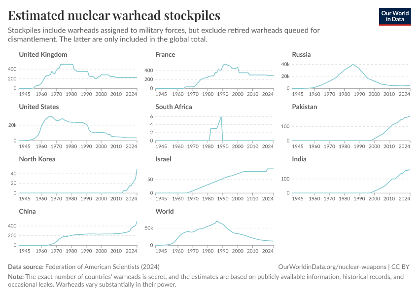 Federation of American Scientists (2024) – with minor processing by Our World in Data. “Estimated nuclear warhead stockpiles” [dataset]. Federation of American Scientists, “Estimated Global Nuclear Warhead Inventories” [original data]. Retrieved March 3, 2026 from https://data-faostat-update-datasets.owid.pages.dev:8789/20250909-093708/grapher/nuclear-warhead-stockpiles-lines.html (archived on September 9, 2025).