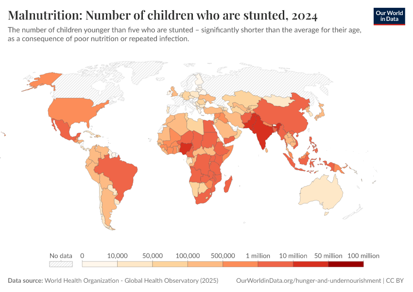 “Data Page: Malnutrition: Number of children who are stunted”. Our World in Data (2026). Data adapted from World Health Organization. Retrieved from https://data-faostat-update-datasets.owid.pages.dev:8789/20260119-070102/grapher/number-children-stunted-who.html [online resource] (archived on January 19, 2026).How to cite this data