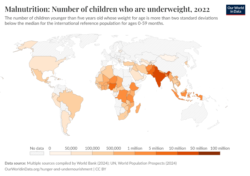 “Data Page: Number of underweight children”. Our World in Data (2026). Data adapted from UNICEF, WHO, World Bank, United Nations. Retrieved from https://data-faostat-update-datasets.owid.pages.dev:8789/20260119-070102/grapher/number-of-children-who-are-underweight.html [online resource] (archived on January 19, 2026).How to cite this data