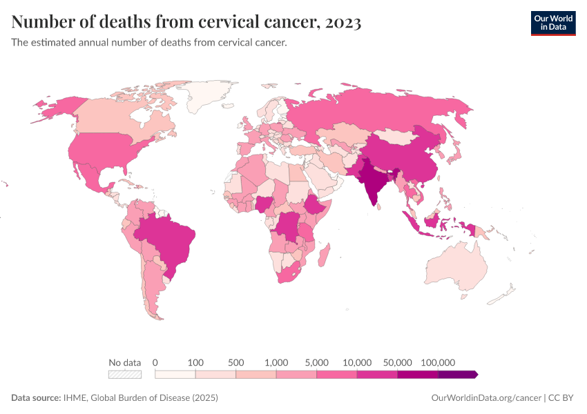 IHME, Global Burden of Disease (2025) – with major processing by Our World in Data. “Number of deaths from cervical cancer” [dataset]. IHME, Global Burden of Disease, “Global Burden of Disease - Deaths” [original data]. Retrieved March 3, 2026 from https://data-faostat-update-datasets.owid.pages.dev:8789/20260211-174736/grapher/number-of-deaths-from-cervical-cancer.html (archived on February 11, 2026).