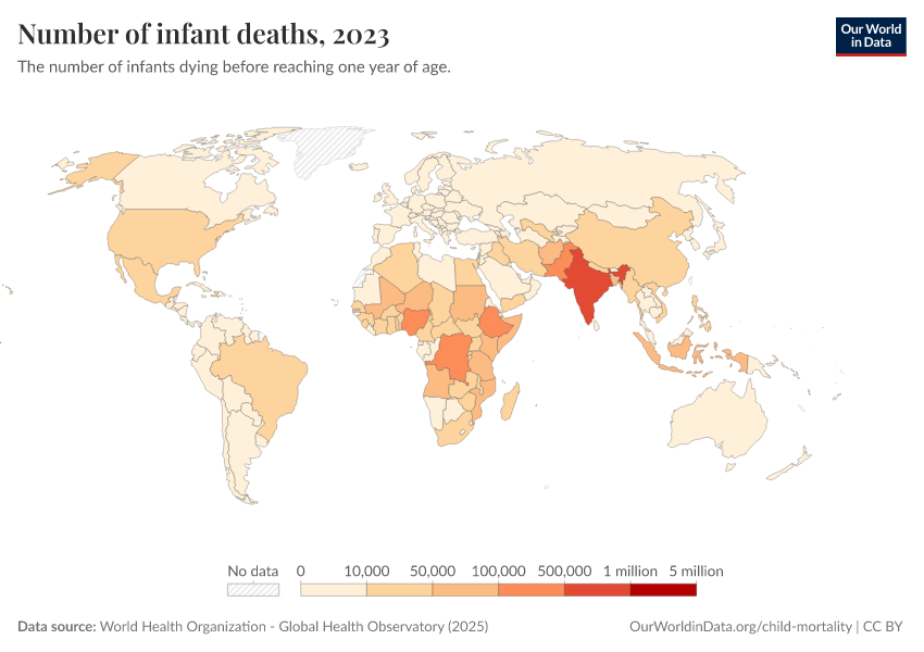 World Health Organization - Global Health Observatory (2025) – processed by Our World in Data. “Number of infant deaths” [dataset]. World Health Organization, “Global Health Observatory” [original data]. Retrieved March 3, 2026 from https://data-faostat-update-datasets.owid.pages.dev:8789/20260119-070102/grapher/number-of-infant-deaths-gho.html (archived on January 19, 2026).