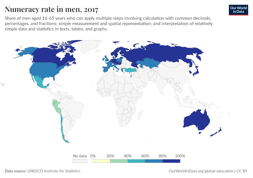 “Data Page: Numeracy rate in men”. Our World in Data (2026). Data adapted from UNESCO Institute for Statistics. Retrieved from https://data-faostat-update-datasets.owid.pages.dev:8789/20251120-211749/grapher/numeracy-rate-in-adult-men.html [online resource] (archived on November 20, 2025).How to cite this data