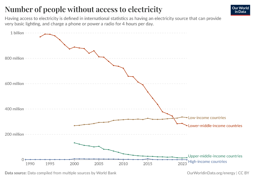 Data compiled from multiple sources by World Bank – with major processing by Our World in Data. “Number of people without access to electricity – World Bank” [dataset]. SDG 7.1.1 Electrification Dataset, World Bank, via World Bank, “World Development Indicators 125”; United Nations Population Division, national statistical offices, and Eurostat, via World Bank, “World Development Indicators 125” [original data]. Retrieved March 3, 2026 from https://data-faostat-update-datasets.owid.pages.dev:8789/20260301-083443/grapher/people-without-electricity-country.html (archived on March 1, 2026).