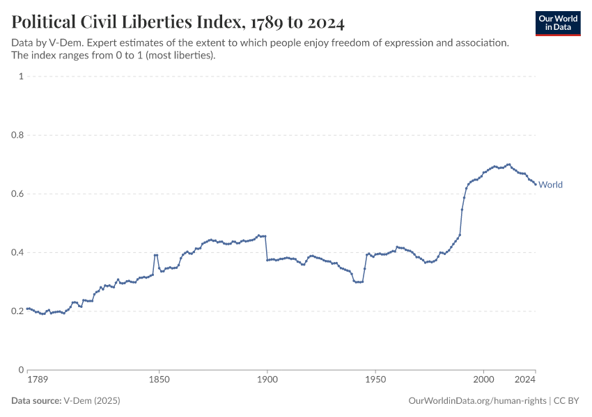 “Data Page: Political civil liberties index”, part of the following publication: Bastian Herre, Lucas Rodés-Guirao, and Esteban Ortiz-Ospina (2013) - “Democracy”. Data adapted from V-Dem. Retrieved from https://data-faostat-update-datasets.owid.pages.dev:8789/20260119-070102/grapher/political-civil-liberties-index.html [online resource] (archived on January 19, 2026).How to cite this data