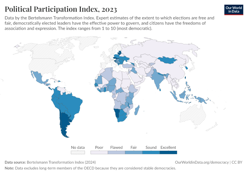 It ranges from countries with poor political participation (scores of 1 to 2.49), over flawed political participation (scores of 2.5 to 4.49), fair political participation (scores of 4.5 to 6.49), and sound political participation (scores of 6.5 to 8.49), to countries with excellent political participation (scores of 8.5 to 10).