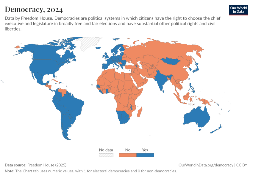 Freedom House (2025) – processed by Our World in Data. “Democracy” [dataset]. Freedom House, “Freedom in the World” [original data]. Retrieved March 3, 2026 from https://data-faostat-update-datasets.owid.pages.dev:8789/20260119-070102/grapher/political-regime-dem-fh.html (archived on January 19, 2026).