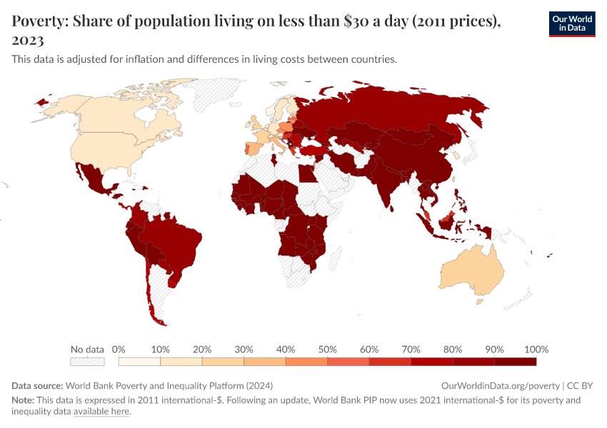World Bank Poverty and Inequality Platform (2024) – with major processing by Our World in Data. “Poverty: Share of population living on less than $30 a day (2011 prices) – World Bank” [dataset]. World Bank Poverty and Inequality Platform, “World Bank Poverty and Inequality Platform (PIP) 20240627_2017, 20240627_2011” [original data]. Retrieved March 3, 2026 from https://data-faostat-update-datasets.owid.pages.dev:8789/20251022-091218/grapher/poverty-share-on-less-than-30-per-day-2011-ppp.html (archived on October 22, 2025).