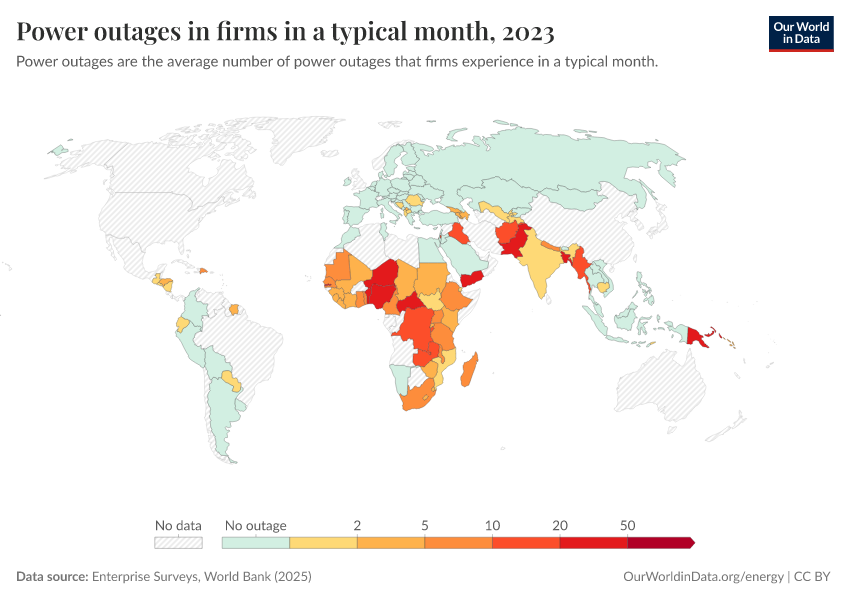 “Data Page: Power outages in firms in a typical month”. Our World in Data (2026). Data adapted from Enterprise Surveys, World Bank. Retrieved from https://data-faostat-update-datasets.owid.pages.dev:8789/20260105-133053/grapher/power-outages-in-firms-per-month.html [online resource] (archived on January 5, 2026).