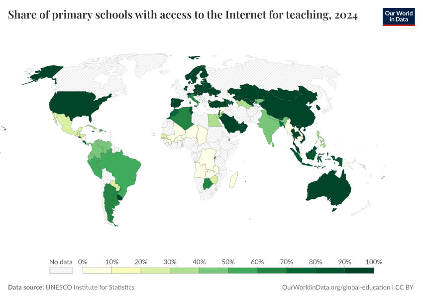 “Data Page: Share of primary schools with access to the Internet for teaching”. Our World in Data (2026). Data adapted from UNESCO Institute for Statistics. Retrieved from https://data-faostat-update-datasets.owid.pages.dev:8789/20260130-180113/grapher/primary-schools-with-access-to-internet.html [online resource] (archived on January 30, 2026).How to cite this data