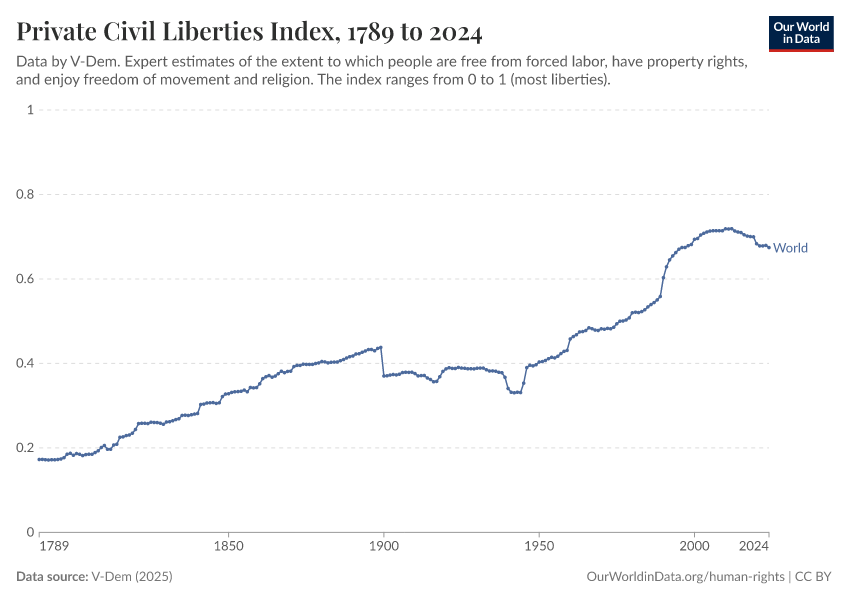 “Data Page: Private civil liberties index”, part of the following publication: Bastian Herre, Lucas Rodés-Guirao, and Esteban Ortiz-Ospina (2013) - “Democracy”. Data adapted from V-Dem. Retrieved from https://data-faostat-update-datasets.owid.pages.dev:8789/20260119-070102/grapher/private-civil-liberties-index.html [online resource] (archived on January 19, 2026).How to cite this data
