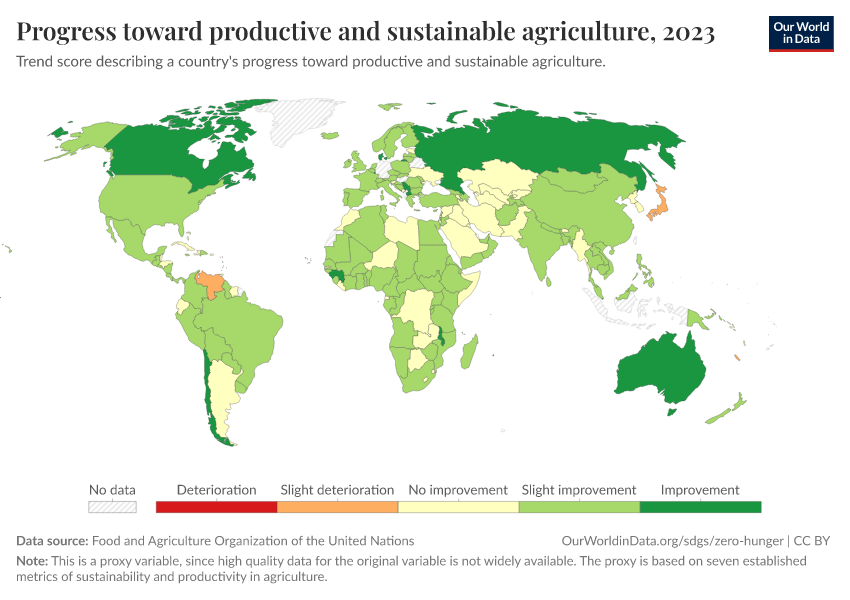 “Data Page: Progress toward productive and sustainable agriculture”. Our World in Data (2026). Data adapted from Food and Agriculture Organization of the United Nations. Retrieved from https://data-faostat-update-datasets.owid.pages.dev:8789/20260130-180113/grapher/progress-toward-productive-and-sustainable-agriculture.html [online resource] (archived on January 30, 2026).How to cite this data