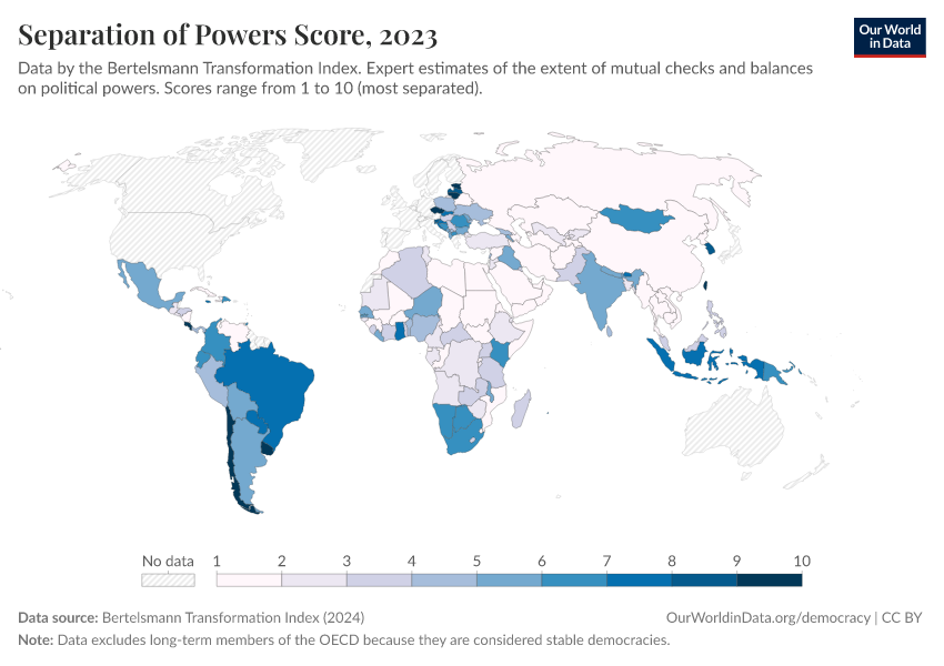 Bertelsmann Transformation Index (2024) – processed by Our World in Data. “Separation of Powers Score” [dataset]. Bertelsmann Transformation Index, “Bertelsmann Transformation Index, Scores” [original data]. Retrieved March 3, 2026 from https://data-faostat-update-datasets.owid.pages.dev:8789/20260204-165456/grapher/separation-of-powers-score-bti.html (archived on February 4, 2026).