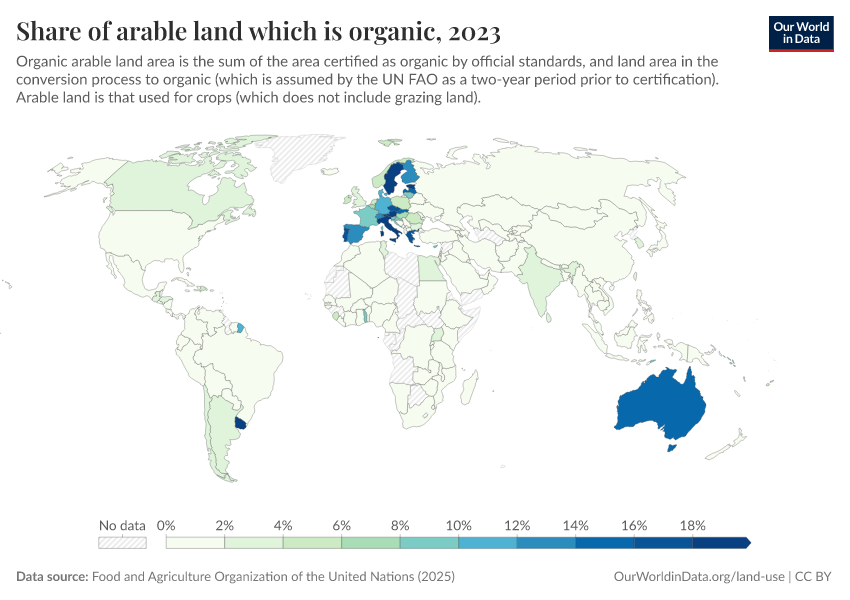 Food and Agriculture Organization of the United Nations (2025) – with major processing by Our World in Data. “Share of arable land that is organic – UN FAO” [dataset]. Food and Agriculture Organization of the United Nations, “Land, Inputs and Sustainability: Land Use” [original data]. Retrieved March 3, 2026 from https://data-faostat-update-datasets.owid.pages.dev:8789/20260226-122020/grapher/share-of-arable-land-which-is-organic.html (archived on February 26, 2026).