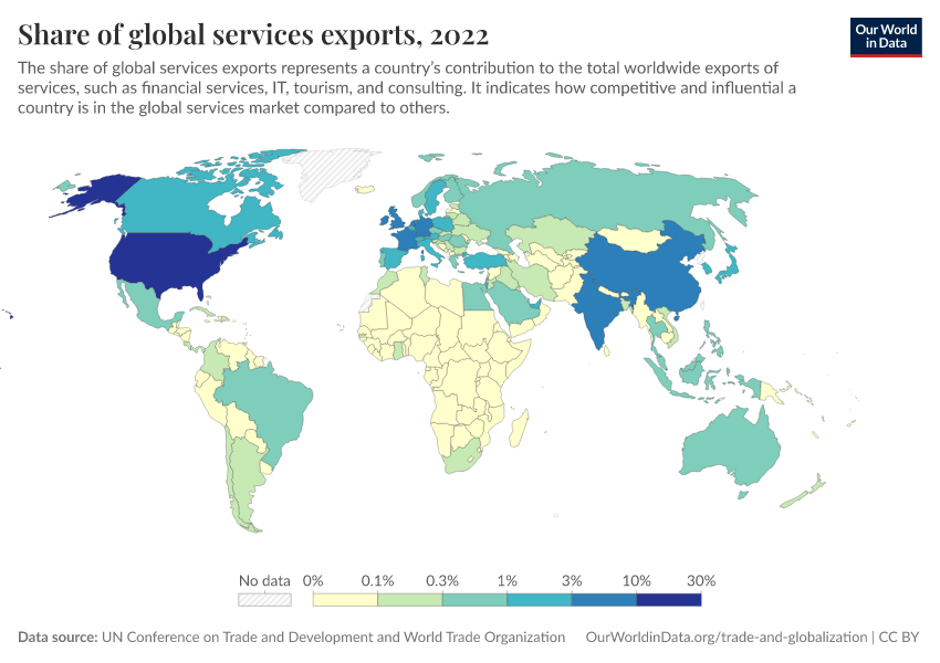 “Data Page: Share of global services exports”. Our World in Data (2026). Data adapted from UN Conference on Trade and Development and World Trade Organization. Retrieved from https://data-faostat-update-datasets.owid.pages.dev:8789/20260130-180113/grapher/share-of-global-services-exports.html [online resource] (archived on January 30, 2026).How to cite this data