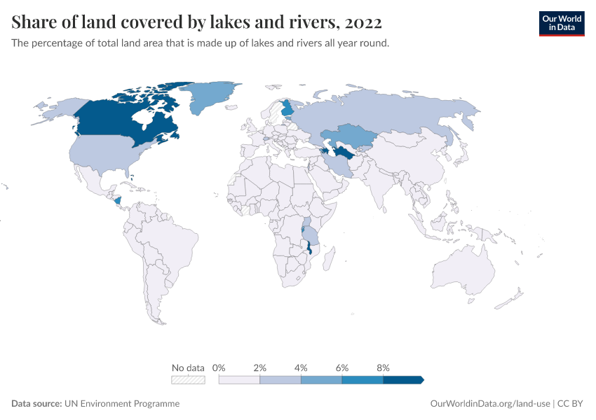 “Data Page: Share of land covered by lakes and rivers”. Our World in Data (2026). Data adapted from UN Environment Programme. Retrieved from https://data-faostat-update-datasets.owid.pages.dev:8789/20260130-180113/grapher/share-of-land-covered-by-lakes-and-rivers.html [online resource] (archived on January 30, 2026).How to cite this data