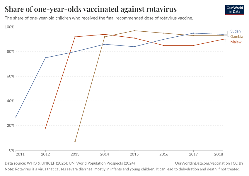 WHO & UNICEF (2025); UN, World Population Prospects (2024) – processed by Our World in Data. “Share of one-year-olds vaccinated against rotavirus” [dataset]. WHO & UNICEF, “WHO Immunization Data - Vaccination coverage”; United Nations, “World Population Prospects” [original data]. Retrieved March 3, 2026 from https://data-faostat-update-datasets.owid.pages.dev:8789/20260119-070102/grapher/share-of-one-year-olds-who-received-the-rotavirus-vaccine.html (archived on January 19, 2026).