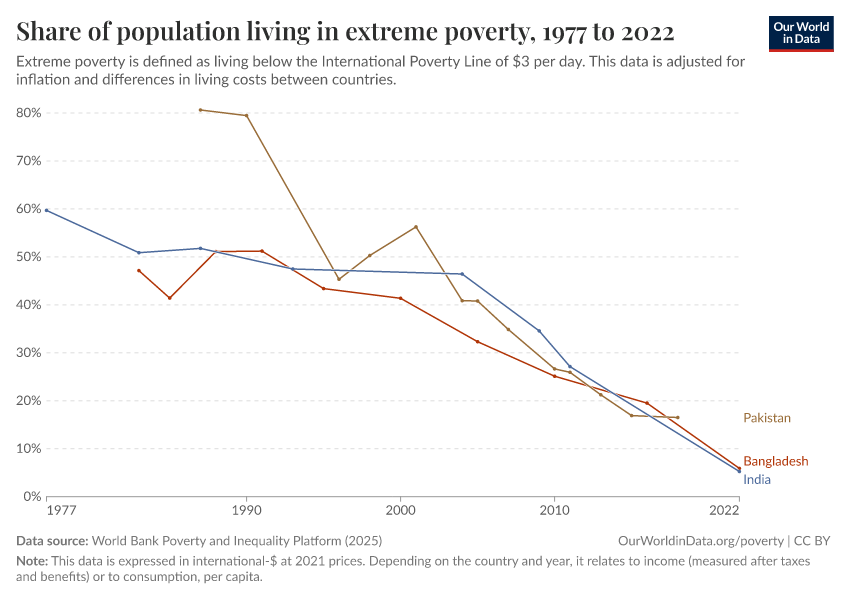 World Bank Poverty and Inequality Platform (2025) – with major processing by Our World in Data. “Share of population living in extreme poverty – World Bank” [dataset]. World Bank Poverty and Inequality Platform, “World Bank Poverty and Inequality Platform (PIP) 20250930_2021, 20250930_2017” [original data]. Retrieved March 3, 2026 from https://data-faostat-update-datasets.owid.pages.dev:8789/20260127-114142/grapher/share-of-population-in-extreme-poverty.html (archived on January 27, 2026).