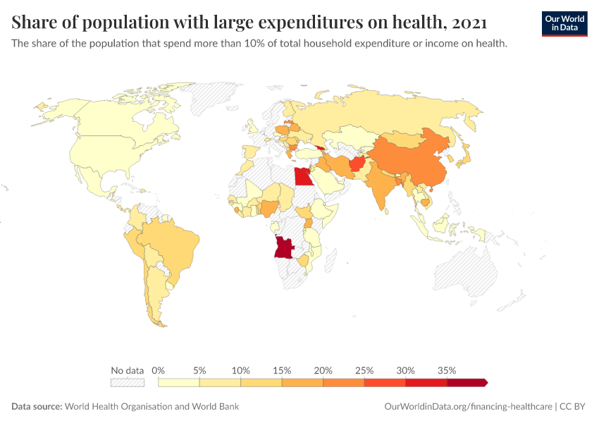 World Health Organisation and World Bank – processed by Our World in Data. “Share of population with large expenditures on health” [dataset]. World Health Organisation and World Bank, “Data from multiple sources” [original data]. Retrieved March 3, 2026 from https://data-faostat-update-datasets.owid.pages.dev:8789/20260130-180113/grapher/share-of-population-with-large-household-expenditures-on-health-10pc.html (archived on January 30, 2026).