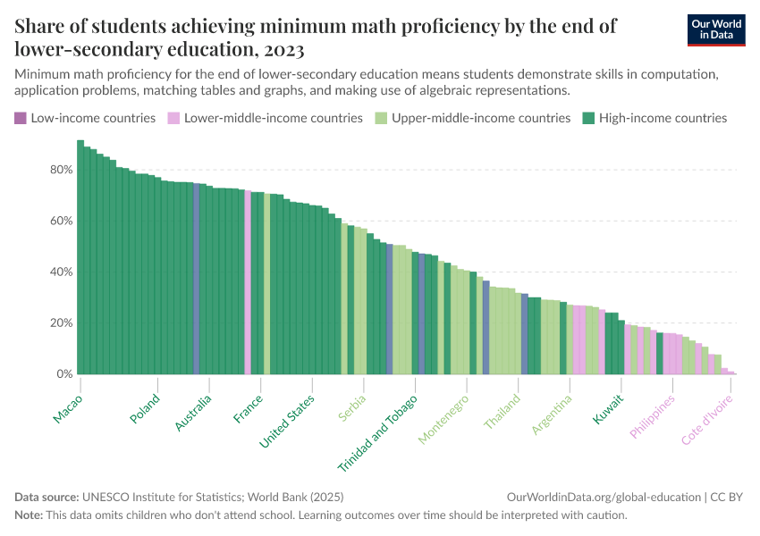 UNESCO Institute for Statistics – processed by Our World in Data. “Share of students achieving minimum math proficiency by the end of lower-secondary education” [dataset]. UNESCO Institute for Statistics, “Data from multiple sources” [original data]. Retrieved March 3, 2026 from https://data-faostat-update-datasets.owid.pages.dev:8789/20260130-180113/grapher/share-of-students-at-end-of-lower-secondary-education-achieving-minimum-math-proficiency.html (archived on January 30, 2026).
