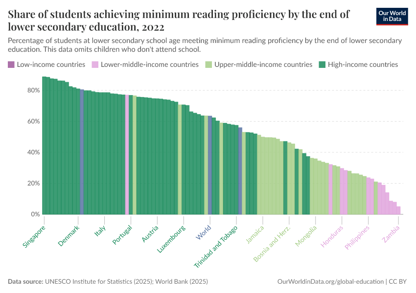 “Data Page: Share of students achieving minimum reading proficiency by the end of lower secondary education”, part of the following publication: Hannah Ritchie, Veronika Samborska, Esteban Ortiz-Ospina, and Max Roser (2023) - “Global Education”. Data adapted from UNESCO Institute for Statistics. Retrieved from https://data-faostat-update-datasets.owid.pages.dev:8789/20260122-091445/grapher/share-of-students-at-end-of-lower-secondary-education-with-minimum-reading-proficiency.html [online resource] (archived on January 22, 2026).How to cite this data