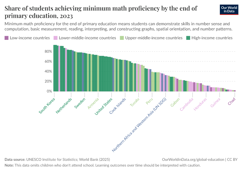 “Data Page: Share of students achieving minimum math proficiency by the end of primary education”. Our World in Data (2026). Data adapted from UNESCO Institute for Statistics. Retrieved from https://data-faostat-update-datasets.owid.pages.dev:8789/20260130-180113/grapher/share-of-students-at-end-of-primary-education-achieving-minimum-math-proficiency.html [online resource] (archived on January 30, 2026).How to cite this data