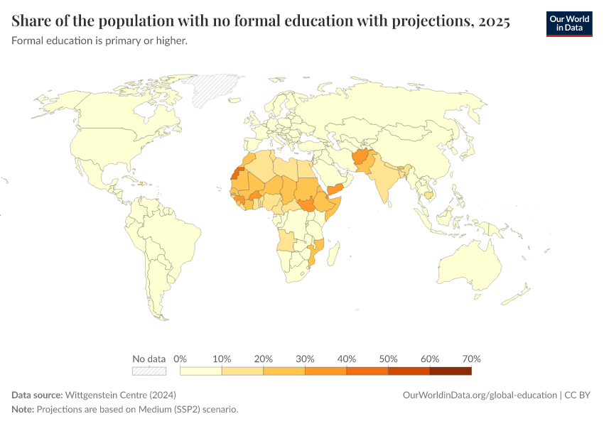 “Data Page: Share of the population with no formal education with projections”, part of the following publication: Hannah Ritchie, Veronika Samborska, Esteban Ortiz-Ospina, and Max Roser (2023) - “Global Education”. Data adapted from Wittgenstein Centre. Retrieved from https://data-faostat-update-datasets.owid.pages.dev:8789/20260212-032504/grapher/share-of-the-population-with-no-formal-education-with-projections.html [online resource] (archived on February 12, 2026).How to cite this data